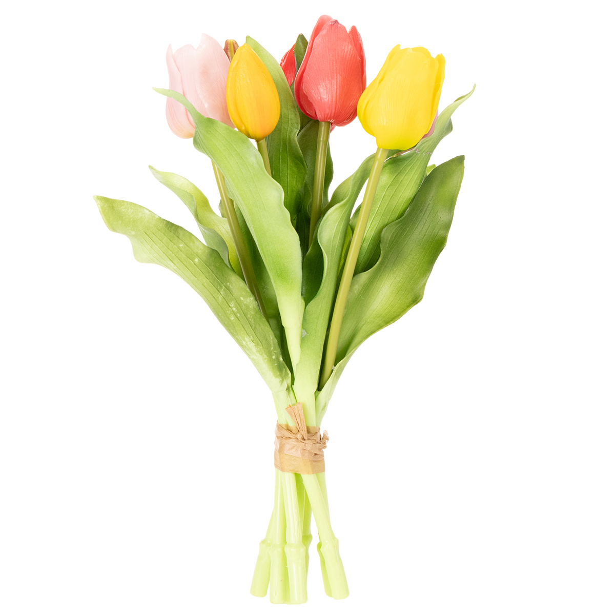 Tulpen symboliseren al sinds jaar en dag liefde, elegantie en een nieuw begin. Rode bloemen staan voor passie, terwijl gele bloemen staan voor vriendschap en optimisme. Roze tulpen daarentegen stralen delicate romantiek uit en zijn een prachtige manier om genegenheid te uiten. Deze harmonieuze kleurencombinatie zorgt ervoor dat deze kunstbloemen in bijna elke stemming of boodschap passen. Ze zijn ideaal om vreugde over te brengen of dankbaarheid te tonen.