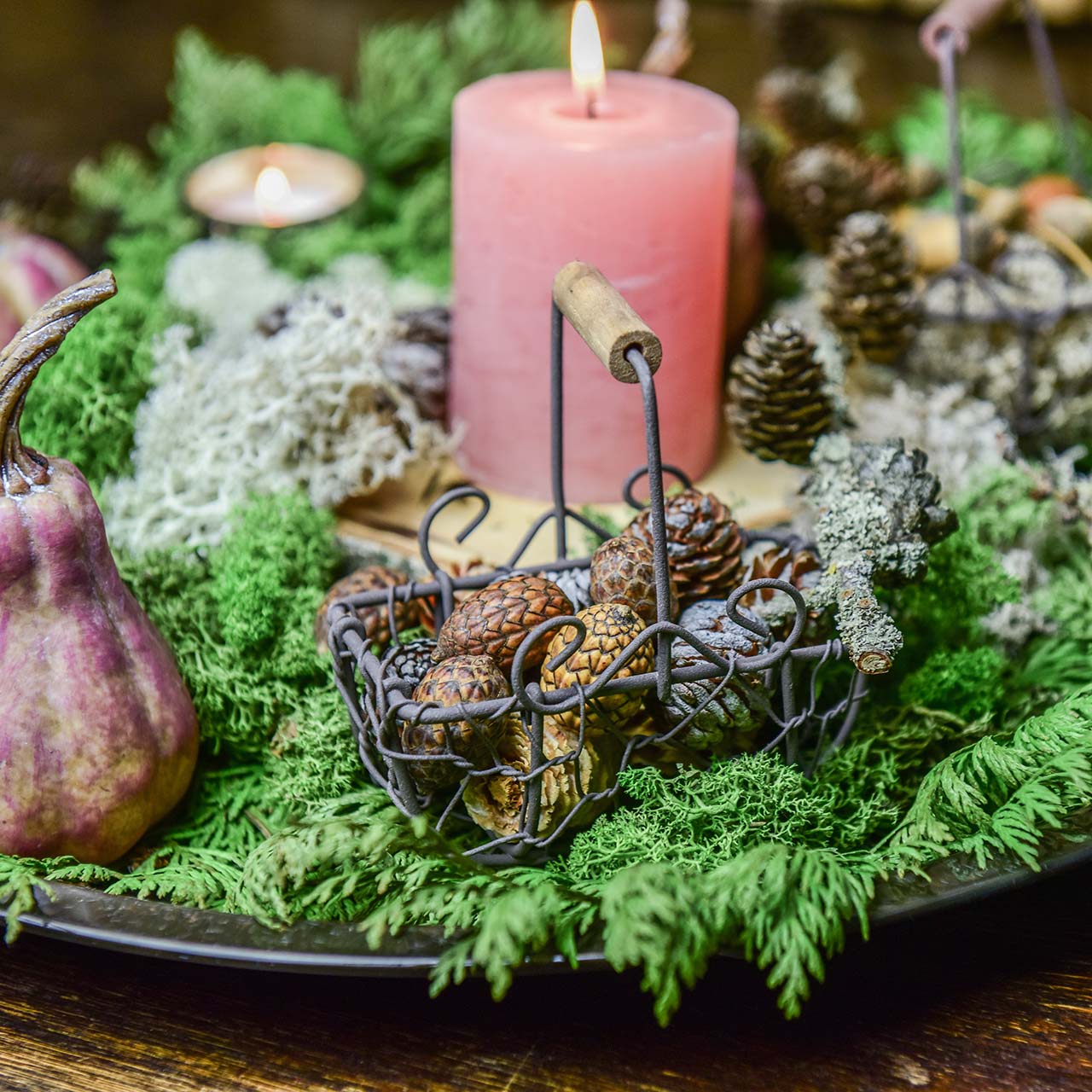 Die Mini-Drahtkörbe mit Holzgriff bestehen aus wetterfestem Metall und werden 3-fach sortiert in einem Set zu 9 Stück geliefert. Der runde Korb ist besitzt einen ungefähren Durchmesser von 8 Zentimetern und ist etwa 11,5 Zentimeter hoch. Der ovale Korb ist circa 10 Zentimeter lang, etwa 6,5 Zentimeter breit und ungefähr 10,5 Zentimeter hoch. Das rechteckige Korbmodell ist circa 10 Zentimeter lang, in etwa 5,5 Zentimeter breit und um die 10,5 Zentimeter hoch.