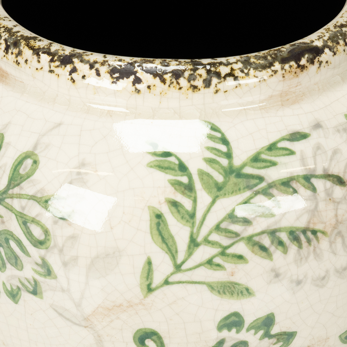 Deze vaas met plantenmotief combineert stijlvolle esthetiek met praktisch gebruik. De delicate groene plantenprint op wit keramiek is op het eerste gezicht betoverend – een harmonieuze combinatie die subtiele frisheid en lichtheid uitstraalt. Ideaal voor iedereen die op zoek is naar een bijzondere blikvanger voor in huis. In een landelijke stijl past hij harmonieus bij meubels van natuurlijk hout of rotan. Maar dankzij zijn ingetogen elegantie komt hij ook prachtig tot zijn recht in een moderne Scandinavische omgeving.