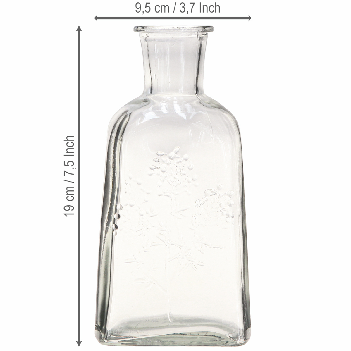 Unsere Glasvase in Gestalt einer Flasche ist mehr als nur ein dekorativer Hingucker – sie ist ein stilvolles Accessoire, das sich nahtlos in verschiedenste Einrichtungskonzepte integrieren lässt. Mit einer Höhe von circa 19 cm und einem rustikalen Design strahlt diese hochwertige Vase eine zeitlose Eleganz aus. Der raffinierte Beerenzweig, der als Motiv plastisch auf die Vase geprägt ist, verleiht ihr eine inspirierende Note. Diese Vase ist ideal für moderne oder klassische Interieurs geeignet und unterstreicht dezent die Schönheit von Blumenarrangements im Landhausstil. Ihre rechteckige Standfläche sorgt für Stabilität, während das durchsichtige Material die Farben der arrangierten Pflanzen wunderbar zur Geltung bringt. Ob im Wohnzimmer, auf dem Schreibtisch oder in Empfangsbereichen, diese Glasvase ist stets eine hervorragende Wahl für stilbewusste Dekorationen.