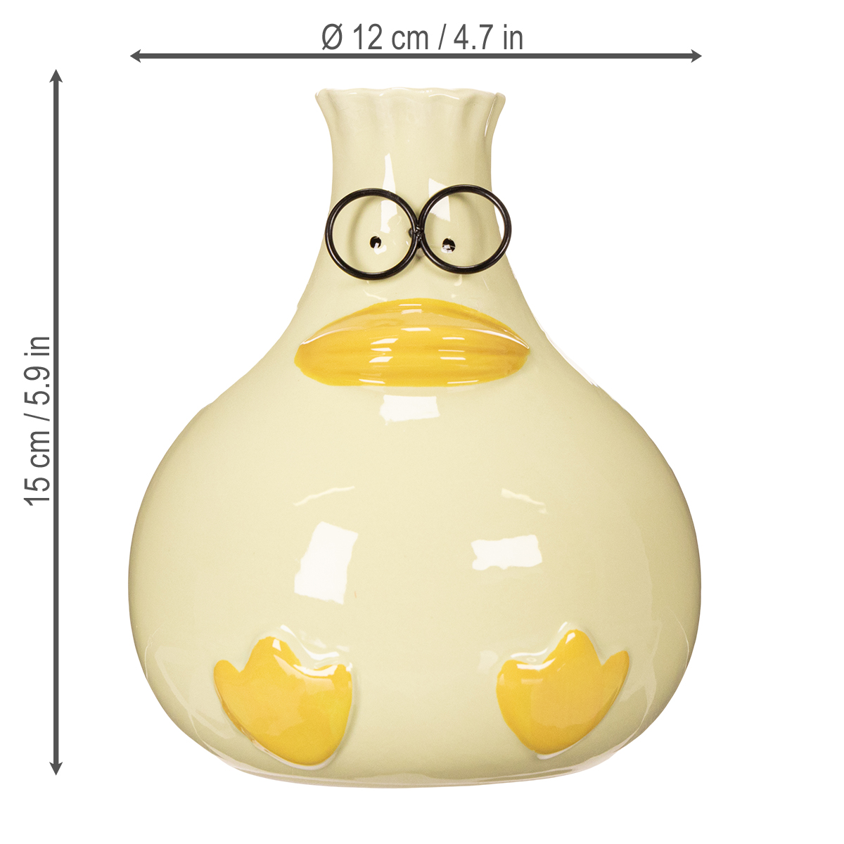 Diese Keramik-Enten-Vasen vereinen witziges Design mit hochwertiger Verarbeitung. Mit einer Höhe von 15 cm und einem Durchmesser von 12 cm sind sie weder zu groß noch zu klein und daher vielseitig einsetzbar. Der robuste Keramikkorpus strahlt nicht nur Stabilität aus, sondern bringt durch die sanfte Farbe Gelb auch eine fröhliche Dynamik in jeden Raum. Das Design ist modern und lässt sich ideal in unterschiedliche Wohnstile integrieren, sei es im minimalistischen, skandinavischen oder spielerischen Stil fürs Kinderzimmer.