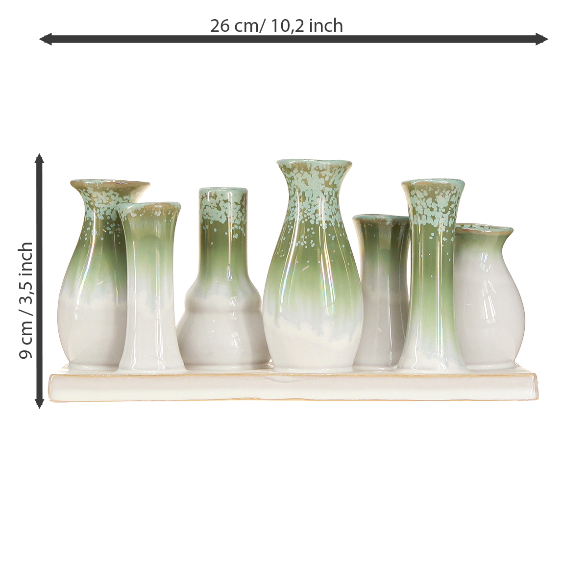 - Set aus 7 dekorativen Keramikvasen auf einem stabilen Tablett
