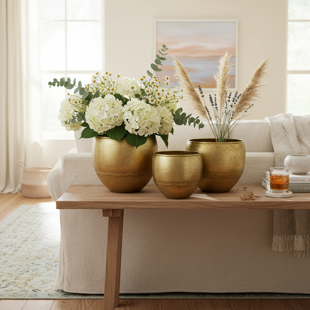 Mais bien sûr, vous pouvez utiliser tout le volume en remplissant les vases en métal de sable décoratif ou de pierres décoratives. Alternativement, vous pouvez y mettre de la mousse florale et remplir le récipient en métal de fleurs artificielles ou séchées à votre guise.